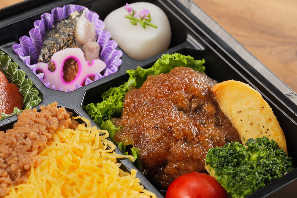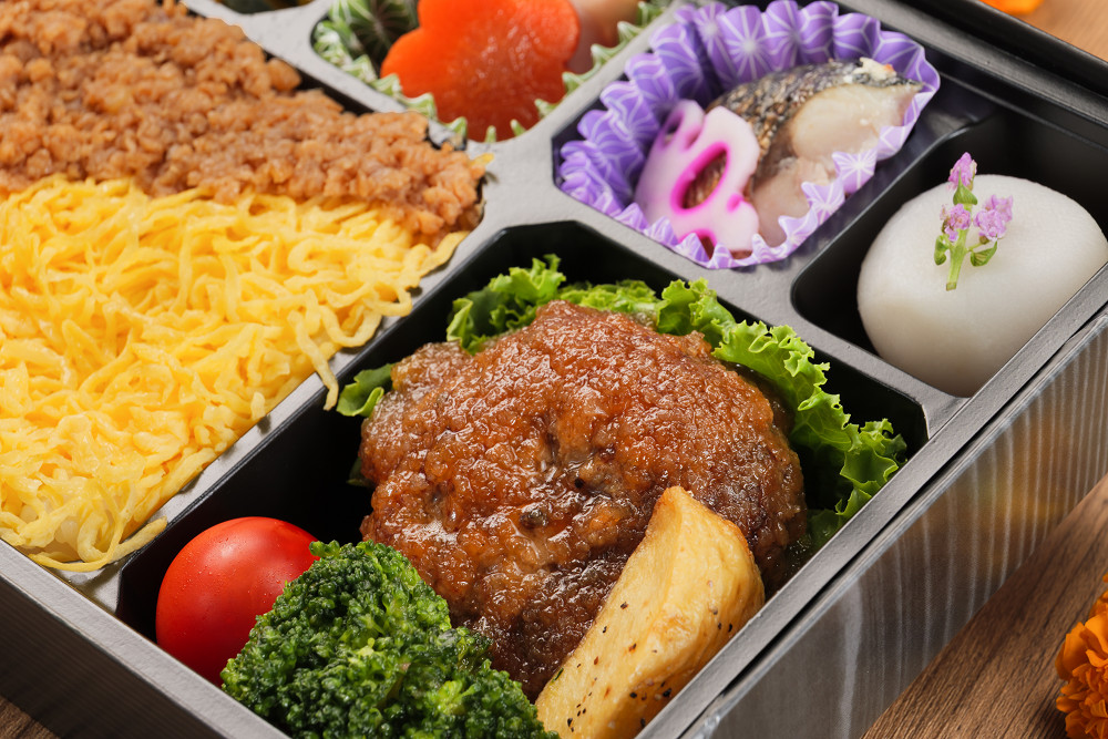 甘辛い味付けでご飯が進む「肉そぼろ重」と、ジューシーな肉汁が魅力の「和牛ハンバーグ」をセットにしました。錦糸卵の優しい甘さとそぼろの旨み、そしてハンバーグの満足感が一度に味わえる贅沢な内容。煮物や焼き魚などの副菜もバランスよく入り、会議からイベントまで幅広いシーンで活躍する一折です。
