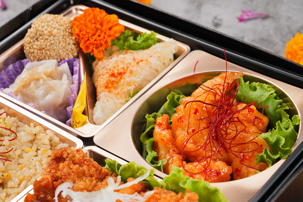 パラっと香ばしく炒めた「特製炒飯」をメインに、香味ダレが食欲をそそる「油淋鶏」と、プリプリの食感がたまらない「海老チリ」を豪華に盛り合わせました。中華料理の人気トップ3を一度に味わえる、ボリューム満点の欲張りな一折。焼売や胡麻団子も添えられ、最後まで飽きさせない大満足の内容です。