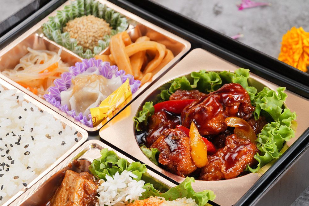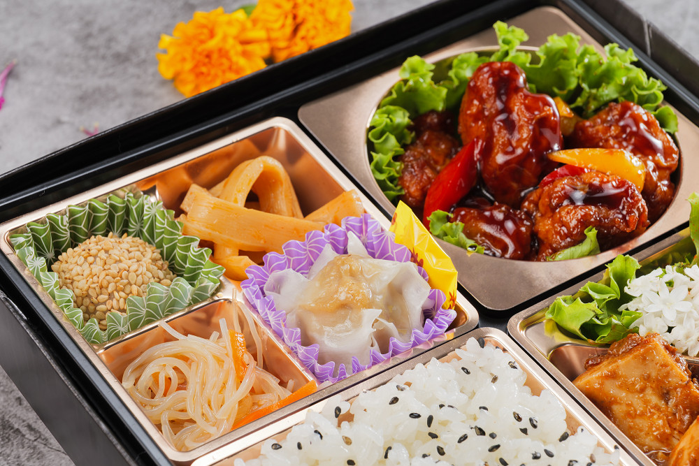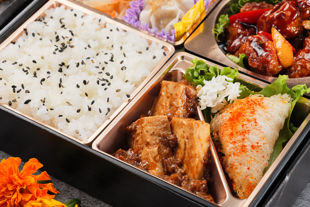 コクのある特製黒酢ダレをたっぷり絡めた「黒酢酢豚」と、本格的な辛旨さが癖になる「四川風麻婆豆腐」を組み合わせました。芳醇な黒酢の酸味と、刺激的な麻婆の辛味は、どちらも白飯との相性が抜群。食欲をそそる濃厚な味わいで、スタミナをつけたい時やガッツリ食べたい時に最適なお弁当です。点心などの副菜も充実し、最後まで飽きずにお召し上がりいただけます。