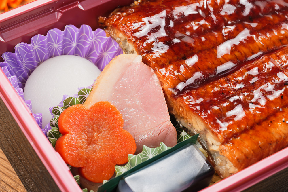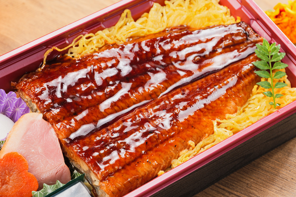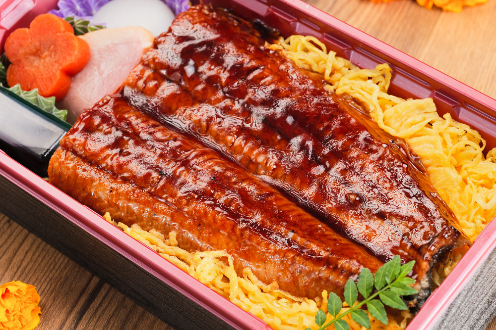 厳選された大判の鰻を、ふっくらと香ばしく焼き上げた至極の一折です。錦糸卵を敷き詰めたご飯に、特製ダレが染み込み食欲をそそります。副菜はシンプルに、鰻の美味しさを存分に味わえる構成に仕上げました。手土産や特別な日のランチに、贅沢なひとときをお届けします。